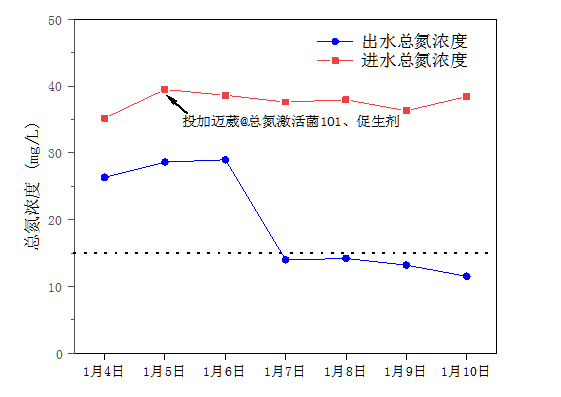 調試結果:邁葳®總氮激活菌101、促生劑顯著提升生化系統反硝化,出水總氮穩定<15mg/L